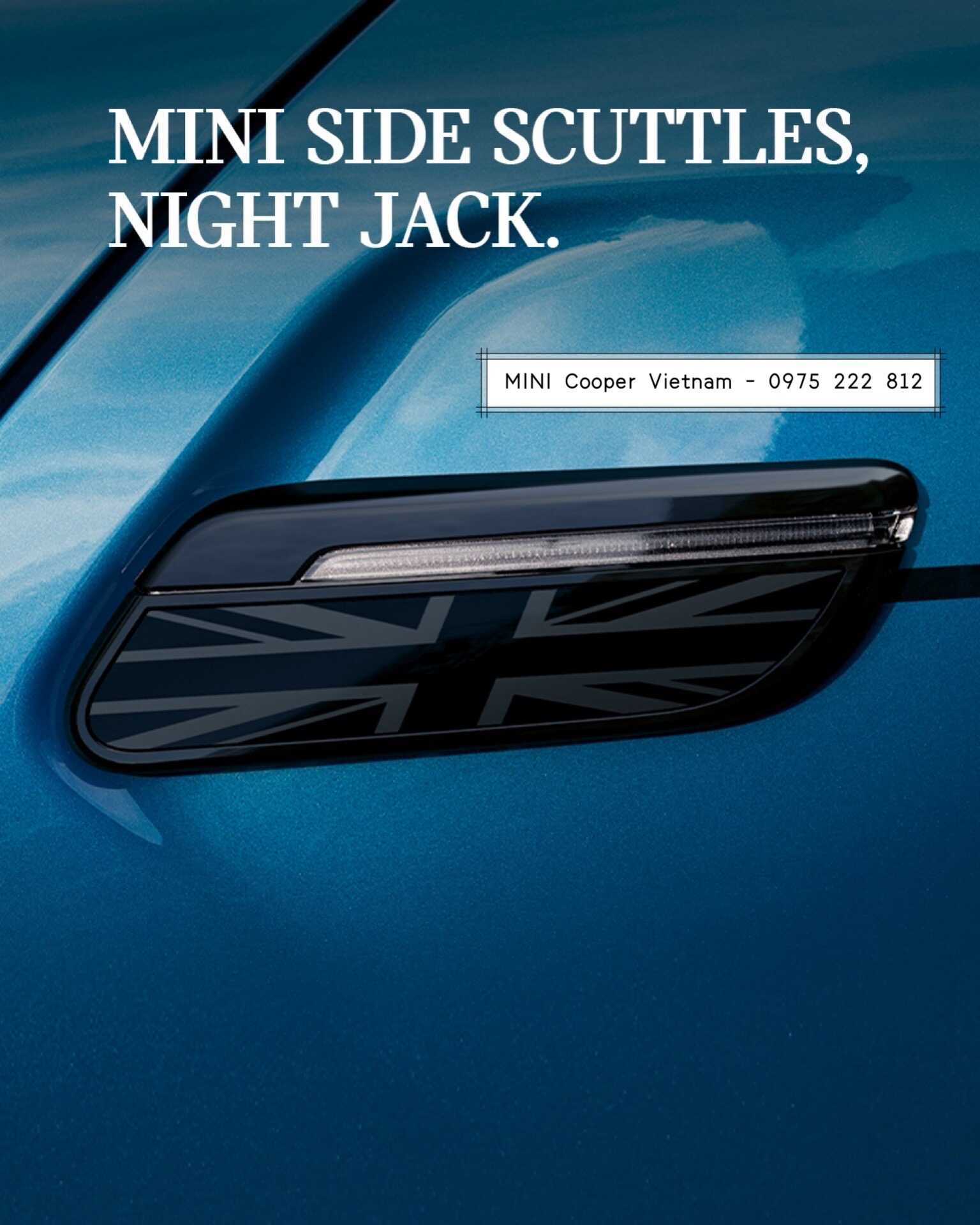 Ngoài ra nóc xe cũng được hoạ tiết Night Jack làm nổi bật và cùng bộ với tất cả các chi khác trên xe, điểm khác biệt lớn nhất là phần đầu xe. Việc thay đổi vị trí của 2 tem decal truyền thống vào vị trí song song chính giữa làm chiếc xe nổi bật, mạnh mẽ hơn khi kết hợp cùng với hốc hút gió tản nhiệt thể thao đặc trưng trên MINI 5 cửa phiên bản S.